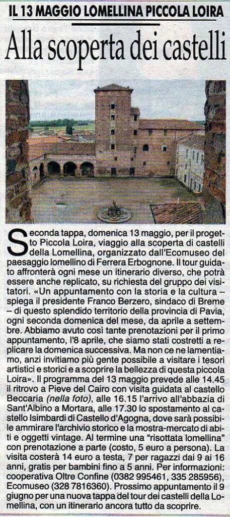 Domenica 10 giugno avrà luogo il terzo appuntamento del progetto “Lomellina Piccola Loira” promosso dall’Ecomuseo del paesaggio lomellino e avviato con grande successo ad aprile (con una replica dovuta alla massiccia partecipazione nella giornata inaugurale, cui prese parte anche la delegazione del Fai di Casale guidata dal giornalista Dionigi Roggero) e riproposta a maggio. Il […]